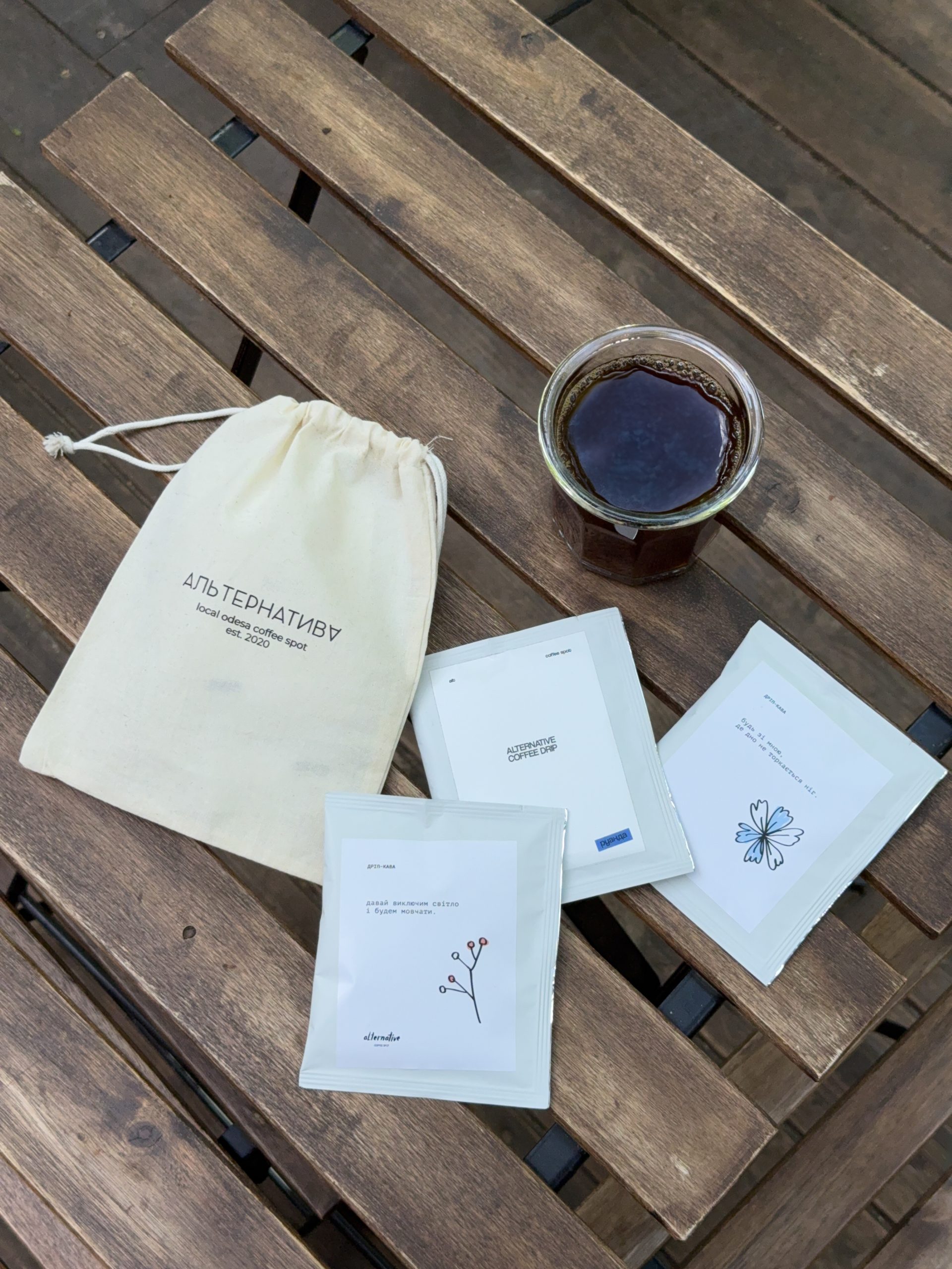 Дріп кава — порція кави, яку можна взяти з собою. Всередині 100% Арабіка спешелті. Спосіб приготування вказаний на упаковці.
