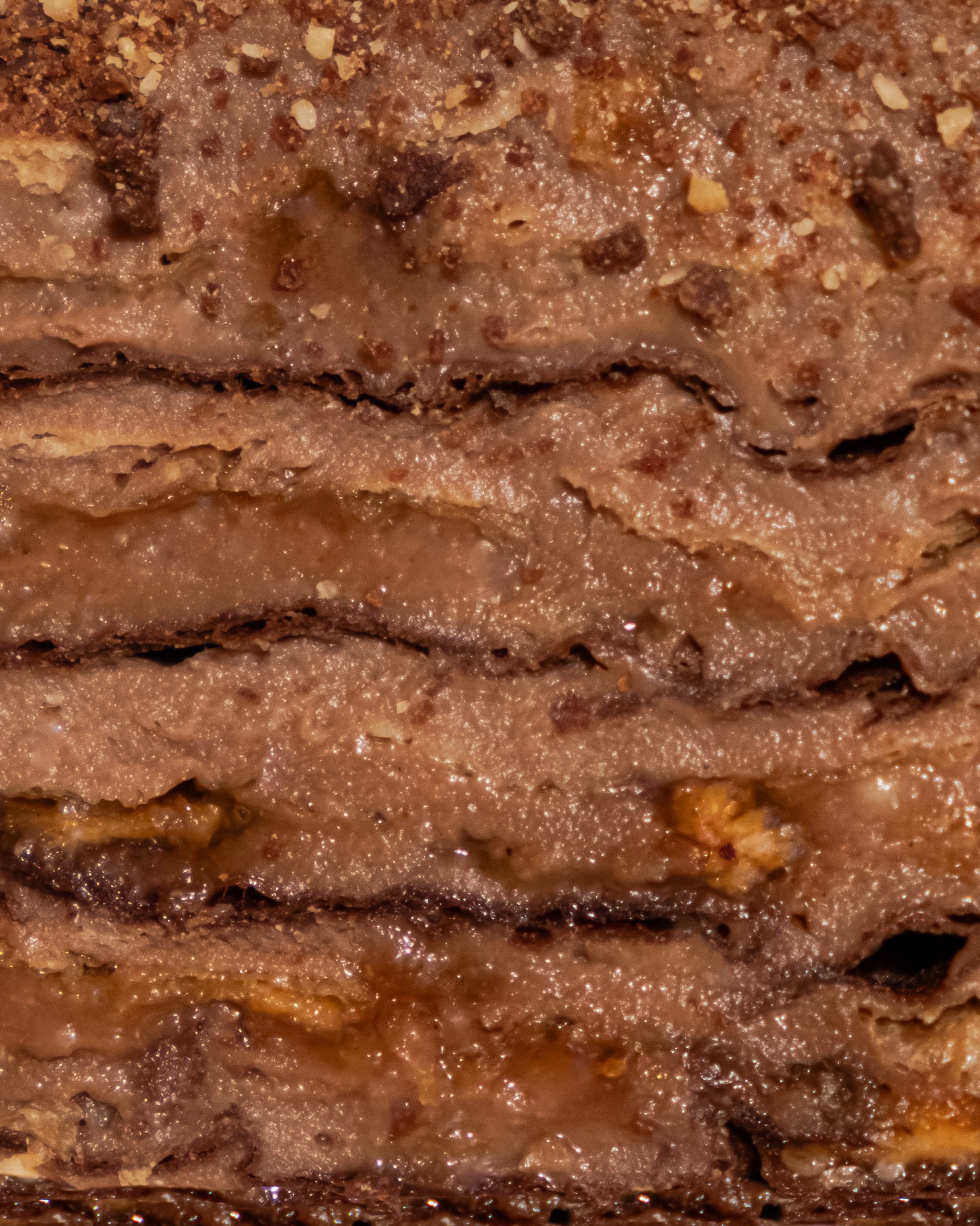 Торт Шоколадний Наполеон — це вишукане поєднання хрустких шарів світлого та шоколадного тіста з ніжним кремом на основі молочного й чорного шоколаду.