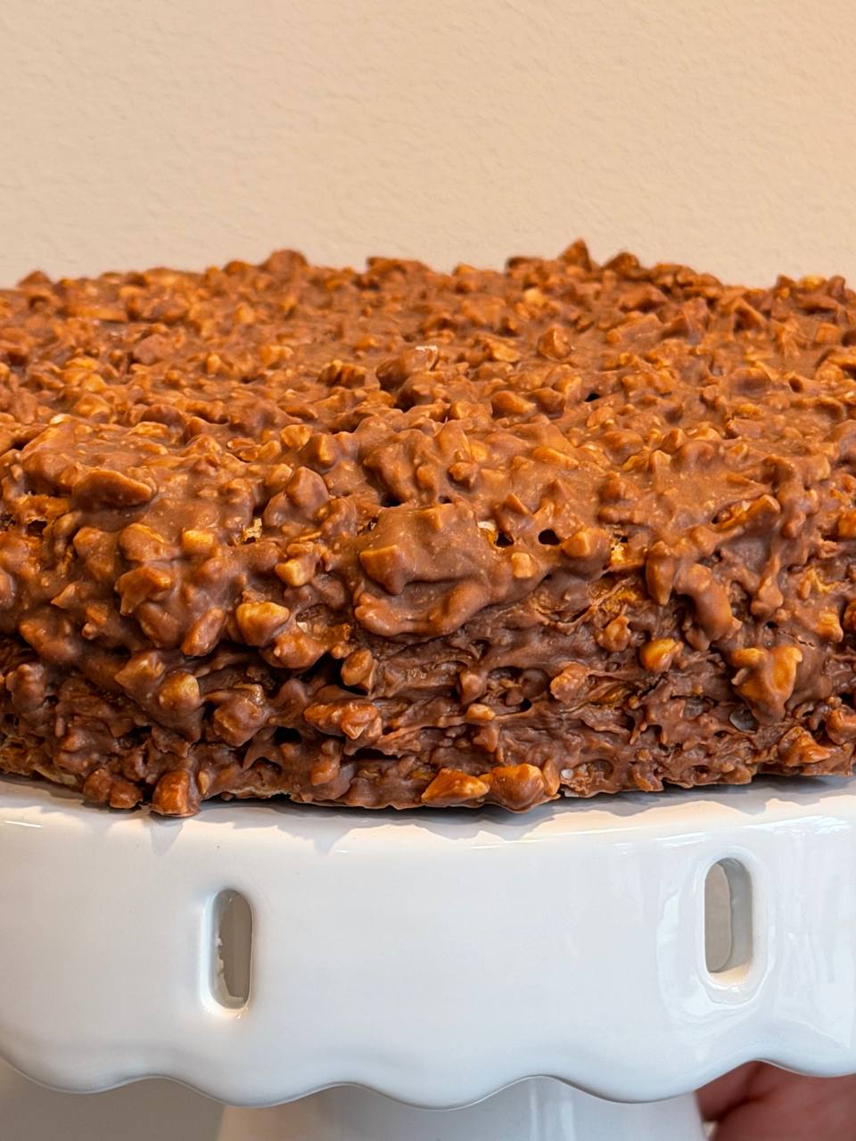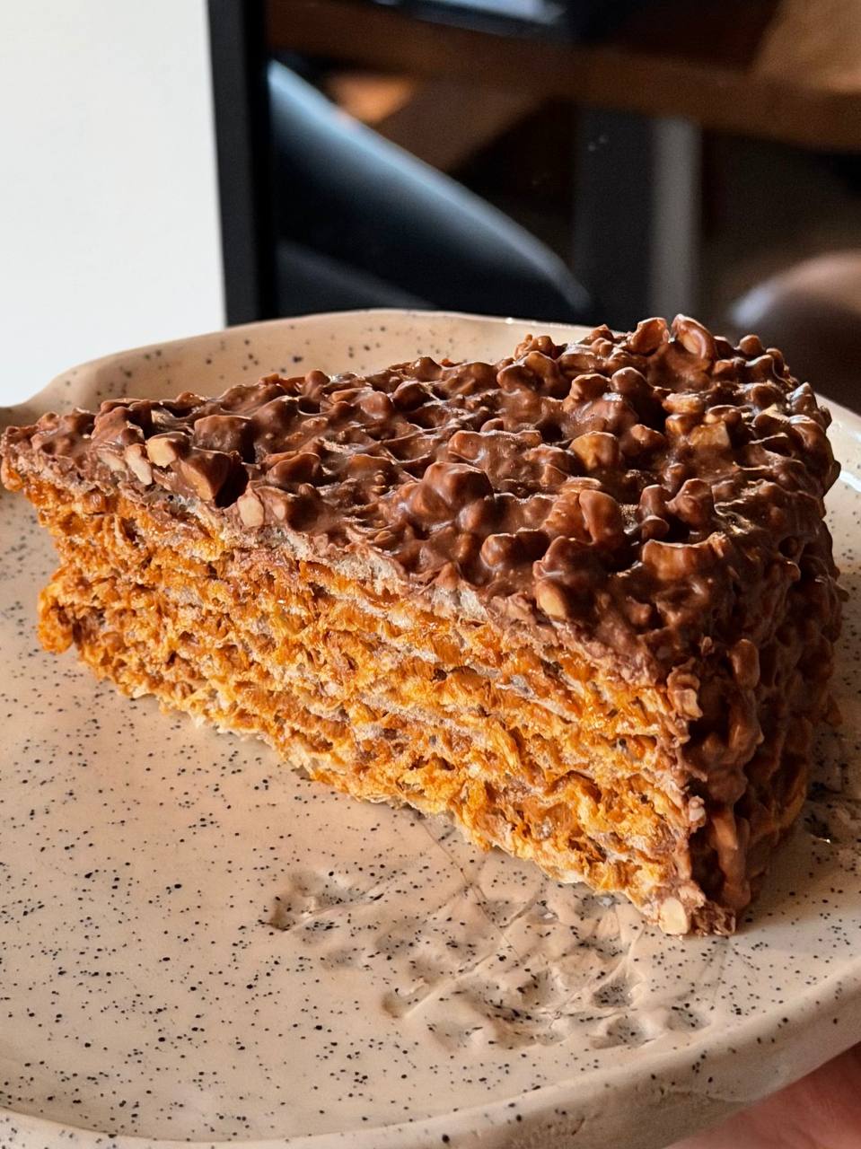 Вафельний Pro – вафельний тортик з хрумких вафельних коржів які щедро змащені кремом на основі вареного згущеного молока та вершкового масла, вкритий шоколадною глазурʼю з арахісом. Удосконалений спогад з дитинства.
